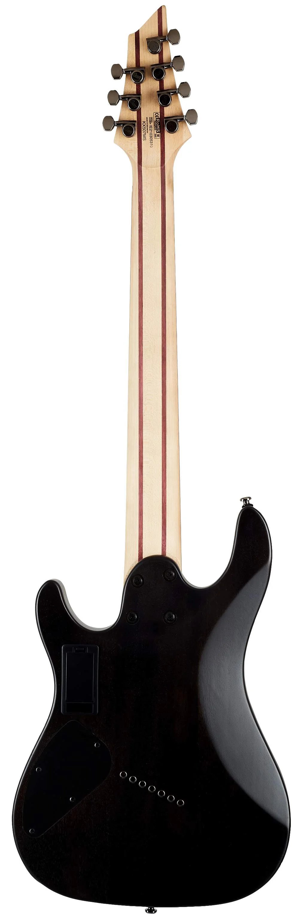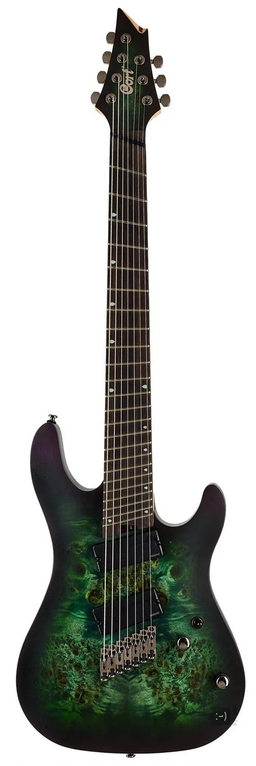 The KX507 Multi Scale also features 25.5” – 27” multi-scale frets with the neutral fret now on the 8th position for better playability, a mesmerizing Poplar Burl top on Mahogany body, 5-piece Maple and Purple Heart neck, Macassar Ebony fretboard and an updated volume and tone knob position for easier reach. Cort’s KX series is an electric guitar with a modern design. Specifically, the seven-string KX507MS with its variable (multiscale) gauge and Fishman Fluence Modern humbuckers is an obvious choice for players of contemporary styles – from modern rock and djent to core and metal – thanks to its affordable price. At first glance, the guitar already catches the eye with its spectacular poplar root top veneer on a mahogany body with a pattern supported by the chosen colour finish. Bolted to the mahogany body is a neck composed of five pieces of maple and purpleheart wood. The Ebony Macassar fingerboard with twenty-four diagonally arranged frets (multiscale concept) and raindrop-shaped position markers (raindrops) is also striking.