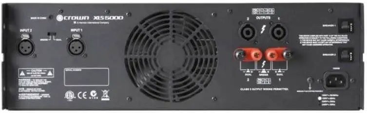The Crown XLS 5000 delivers 1800 watts per channel in four-ohm stereo mode, and a staggering 5000 watts in four-ohm bridge-mono mode. Housed in a rugged, 3U, all-steel chassis, the highly reliable XLS 5000 is equipped with an efficient forced-air fan to prevent excessive thermal buildup. The front panel sports dual precision-detented rotary level controls, a power switch with accompanying LED, and six additional LEDs indicating signal, clip, and fault for each channel. Rear panel connections include two electronically balanced XLR inputs as well as touch-proof binding post and Speakon outputs.