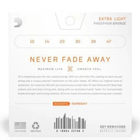 D’Addario XS Acoustic Phosphor Bronze combines our most popular acoustic with our most advanced string coating technology, delivering crystal clear tone, smooth feel, and superior tuning stability — plus the longest string life. Available in Phosphor Bronze for 6- and 12-string acoustic guitars, from extra light to medium. The secret is a unbelievably thin coating that preserves tone, above all, but also reduces squeaks and resists fraying. This coating not only gives you longer string life, but also a comfortable feel on the fingers so you can play your best all night long.This eliminates the awkward stage common to other coated strings where your bottom strings far outlast your top strings. From chords to leads, and from stage to studio, you’ll sound your best strung up with D’Addario XS Phosphor Bronze strings.