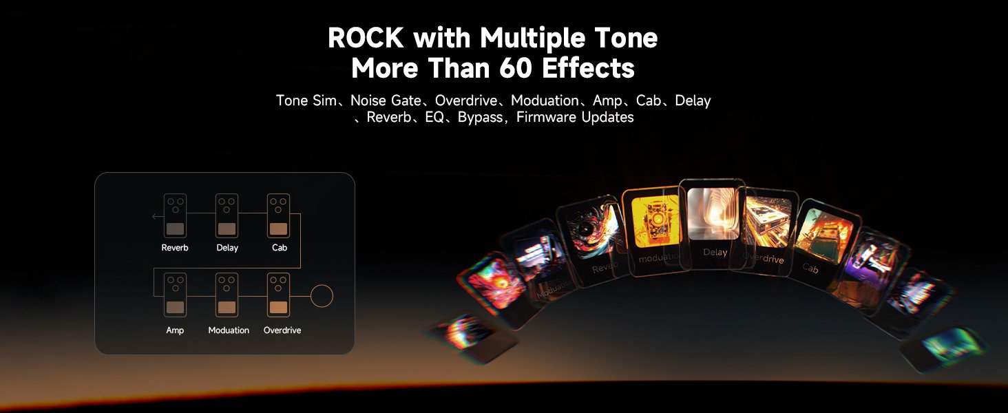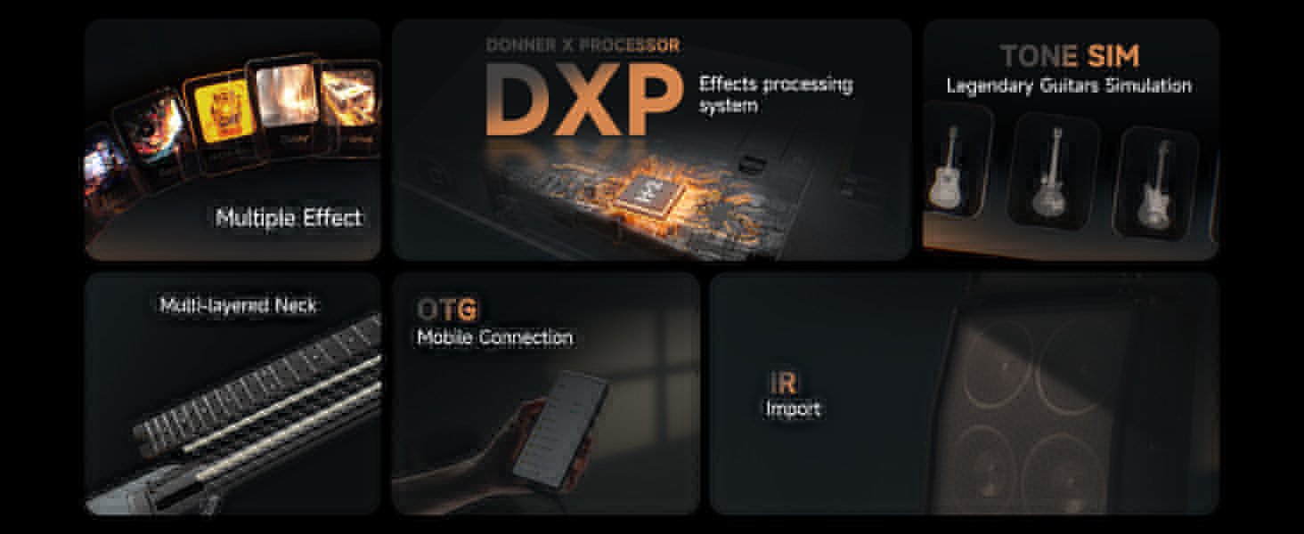 • Real Amp Modeling – The DONNER H2 chip, designed and developed in-house, supports more advanced and complex audio algorithms, delivering higher-quality audio sampling. With 19 classic amp models and 12 cabinet simulations, the HUSH X PRO Donner electric guitar allows independent control of each, making it easy to switch between different amp tones during performances, practice, and recording