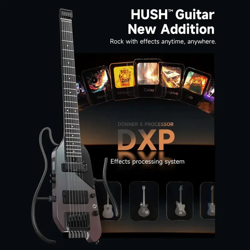 • Tone Sim – With 4 electric guitar tones and 3 acoustic guitar tones sampled from authentic sources, the HUSH X PRO offers 7 distinct tone simulations. The portable guitar seamlessly combines the unique tones of multiple guitars with versatile effects, delivering unparalleled musical diversity and convenience