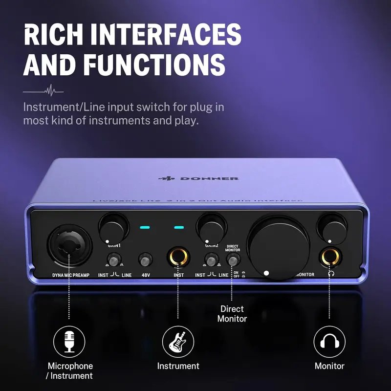 - [2 In 2 Out]This audio interface has 2 high-headroom instrument inputs and 2 out USB-C audio interfaces with a high-headroom, Class A DYNA microphone preamplifier, giving your vocal recordings a brighter and more open sound. Instrument/Line input switch for plug in most kind of instruments and play.