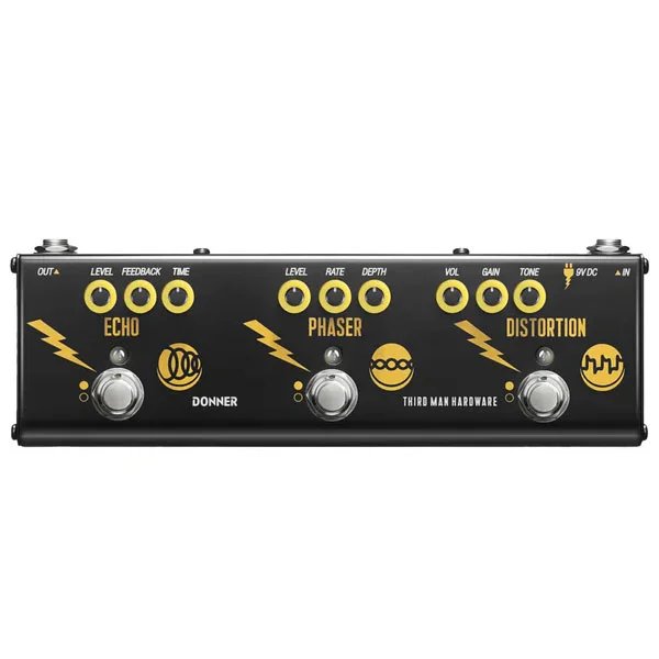 Donner Triple Threat starts with a wide-range high gain distortion, with volume, gain, and tone controls to create a threatening rock sound. A classic phaser upgraded from the Pearl Tremor pedal by Donner is next with extended mod controls. Third in line is an analog voiced echo, originated from Donner’s first ever pedal, the Yellow Fall Delay released in 2013, with warm analog tone and rich feedback. With upgraded circuit design and tuning the tone to Jack’s specifications, Donner combined three analog circuits into one metal enclosure, delivering unique analog sounds and versatile utility for musicians on the go. Third Man Hardware designed the external appearance of The Triple Threat, adding its signature patterns such as lightning bolts from the Tesla tower on the panel, three sharp stripes in front and the signature diagrams from Third Man Hardware’s logo on both sides of the pedal.