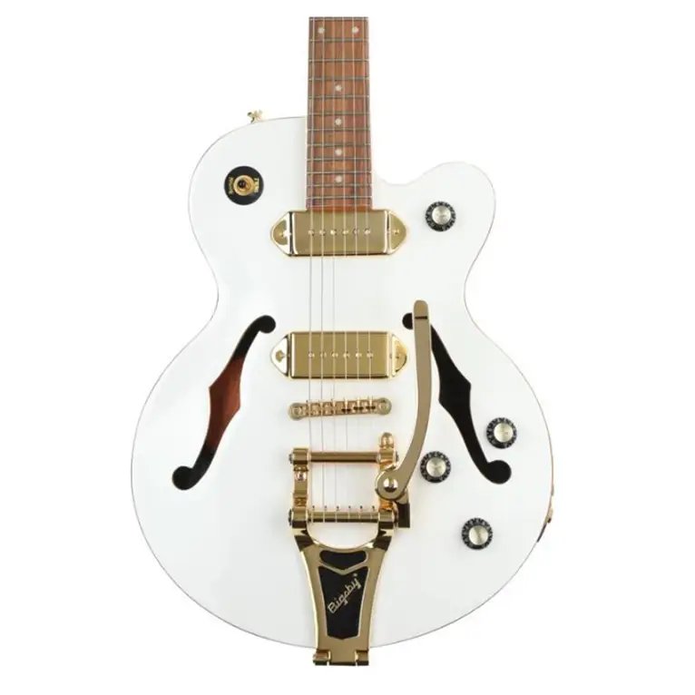 The Wildkat Royale’s innovative design starts with a solid piece of warm, sustain-rich mahogany that is computer-routed to create an acoustic guitar-like body except with a “center block” area like an ES-335. The body is then covered with a beautiful pearl white finish with gold sparkle binding and gold hardware to create a semi-hollow body masterpiece. The Wildkat Royale’s mahogany body is matched with a hand-fitted, glued-in maple neck for maximum tone and sustain. It features a rosewood fingerboard and an authentic gold B70 licensed Bigsby vibrato for even more sonic versatility. The vintage voice of this ‘Kat comes from a pair of Epiphone gold “dog ear” P- 90 Classic pickups specifically designed by Epiphone.