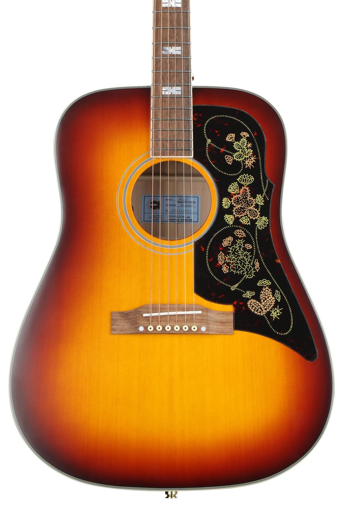 Epiphone’s Masterbilt collection serves up a meticulous re-creation of the very rare Epiphone Frontier. The Masterbilt Frontier acoustic-electric features a solid Sitka Spruce top with the iconic Frontier ”Rope and Cactus” pickguard, a bone nut, and state-of-the-art Fishman Sonitone electronics for accurate acoustic tone when plugged in.