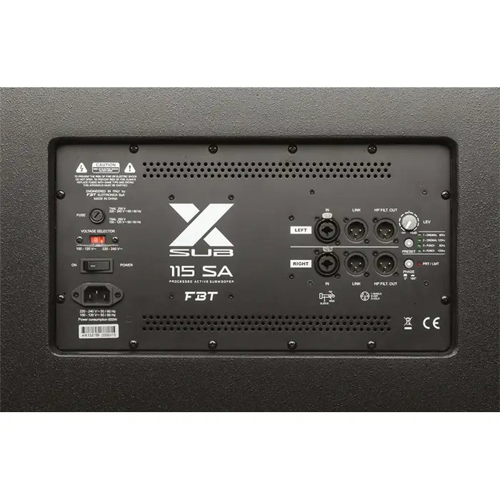 The FBT X-SUB 115SA , 1 x 15″ bass-reflex design subwoofer, is the perfect low frequency extension and the ideal companion for the FBT X-LITE and FBT X-PRO series. Frequency response of 42Hz to 120Hz @ -6dB, maximum SPL of 135 dB peak, 1200W Class D amplifier. Equipped with a 15\” (380mm) high excursion woofer and a 1200W RMS internal amplifier. It has a digital signal processor with 4 presets, allowing extensive customisation of low frequencies up to mid-high levels.