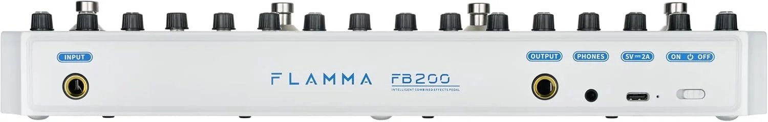 It’s certainly convenient that the device comes preloaded with these amp and cabinet sims, but to provide added versatility, it also supports third-party impulse response loading across 9 additional loading slots. It is even compatible with the FLAMMA app, allowing users to share and download tones and presets through the cloud. The FB200 strikes a balance between portability and practicality. Measuring 311 × 67.5 × 49.7 mm and weighing just over half a kilogram (578 g), it is compact enough to slip into a gig bag pocket yet large enough to provide four multi-purpose footswitches and a generous panel of 16 control knobs. The top surface includes a three-character LED display, which may not win awards for visual clarity but gets the job done when navigating presets or adjusting parameters on the fly.