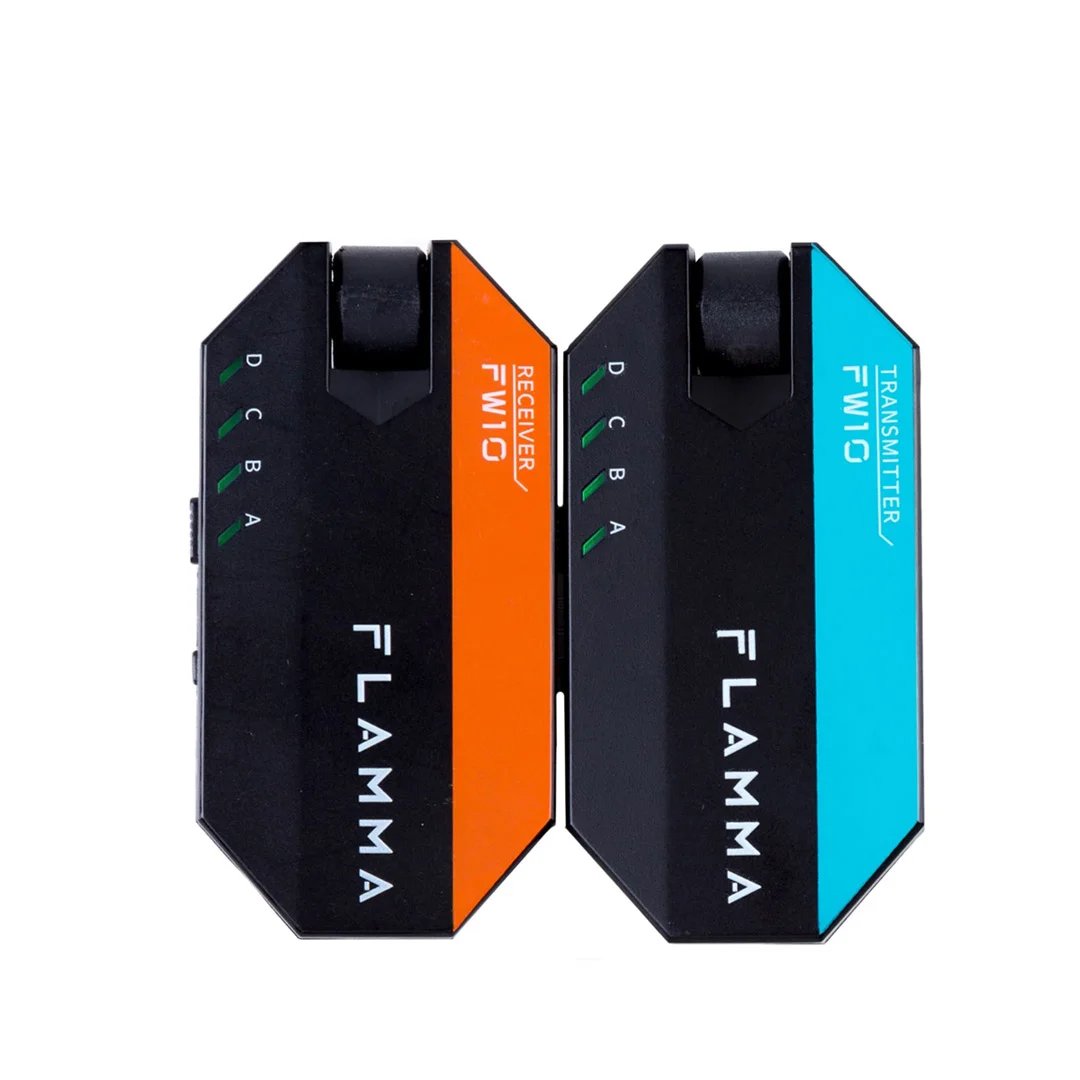 The Flamma FW10 Wireless System is designed to free guitarists from the bondage of instrument cables so they can focus more on their stage dives. The FW10 controls are extremely simple featuring an on/off switch and a channel selector. Each transmitter and receiver can select one of 4 different channels to find the best signal and connect multiple instruments or outputs.