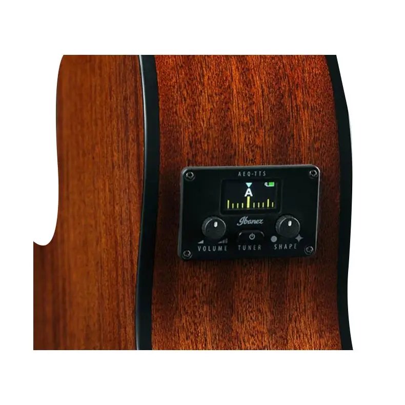 The Ibanez T-bar under-the-saddle pickup equalizes the volume from each string and delivers a well-balanced signal. This is combined with the new AEQ-TTS preamp, a small and simple unit which has only two control knobs, volume and shape. This at-a-glance tone control offers natural acoustic sound in the centre position. It allows players to adjust the tone easily and enables them to go from low, fat and powerful tones to a bright and crispy sound while adjusting only one knob. A new easy-to-read onboard tuner with LCD (liquid crystal display) is located on the preamp.