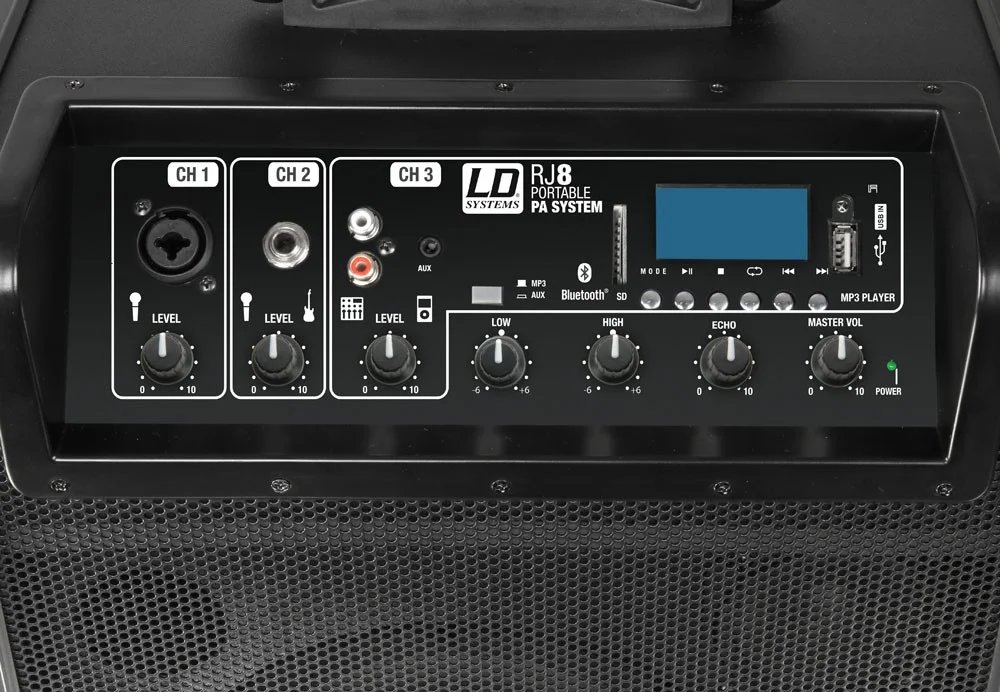 The LDRJ8’s major feature is a built-in Bluetooth player which permits wireless streaming to the system. It also supports SD card and USB storage devices. The player menu includes multiple genre specific presets for instant EQ adjustment.