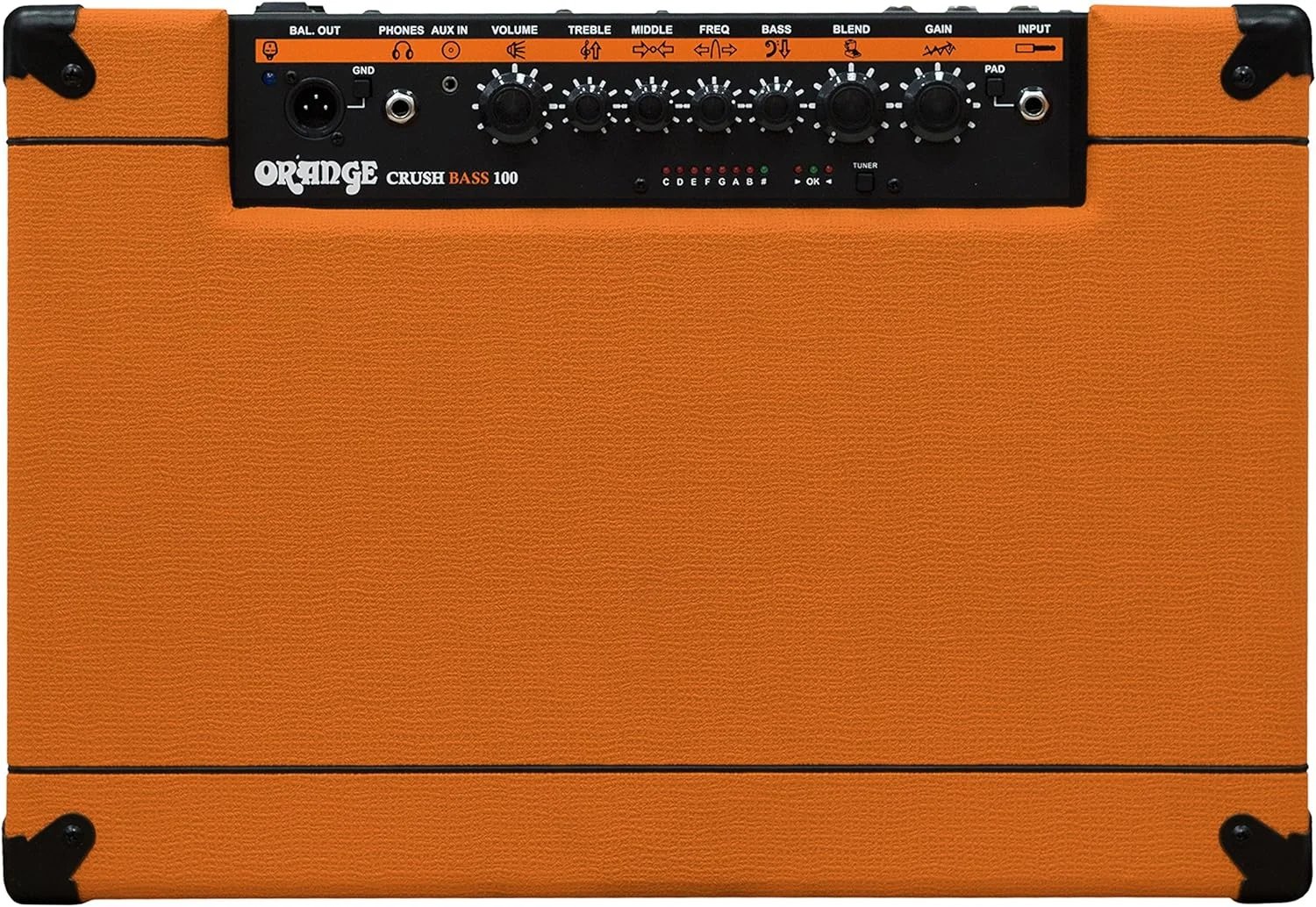 The Crush Bass 100 features an EQ circuit inspired by our prestigious 4 Stroke Series amplifiers. At its centre is a parametric mid band. This presents players with a much greater degree of control over the sound than a traditional EQ, allowing them to vary the frequencies they want hear. The mid band covers a wide range, sweeping from 300Hz (fully anti-clockwise) to 2.7kHz (fully clockwise), meaning this amp can be fine tuned to suit any musical style. The active circuitry allows for up to 15dB of boost or cut on the bass and middle frequencies, and up to 20dB on the treble side. The Crush Bass 100 features a balanced output (post EQ) for connecting to a PA in live situations. The headphone output features our Cabsim circuitry which emulates the response of our stage-ready OBC bass speaker cabinets during silent practice. This signal can also be sent to a console for seriously authentic direct recording. The Aux. input allows for connecting external audio sources for backing tracks whilst the handy onboard tuner makes for quick tune-ups between jams.