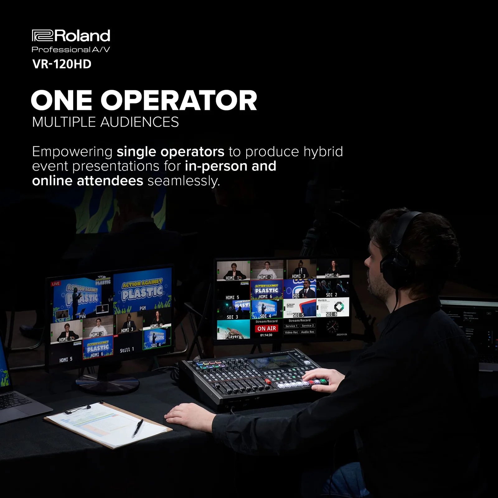 Add a professional hybrid event AV mixer to your production kit with this VR-120HD Direct Streaming AV Mixer from Roland. Combining the advanced functions of a video switcher and an audio mixer, the portable VR-120HD is ideal for live school events, houses of worship, council meetings, corporate events, concerts, and other live performance venues. The switcher offers the capability of live streaming up to two simultaneous streams to popular online forums, such as Facebook and Twitch. The unit features six HDMI inputs and six SDI inputs capable of handling resolutions up to 1080p60, as well as three HDMI and three SDI outputs, 42-channel audio mixing, and direct LAN and USB-C live streaming outputs. Perfect for use as a standalone production switcher, the VR-120HD offers an integrated 7″ touchscreen display with a graphical menu for previewing all your incoming signals and viewing your intended program output without ever needing additional preview monitors.