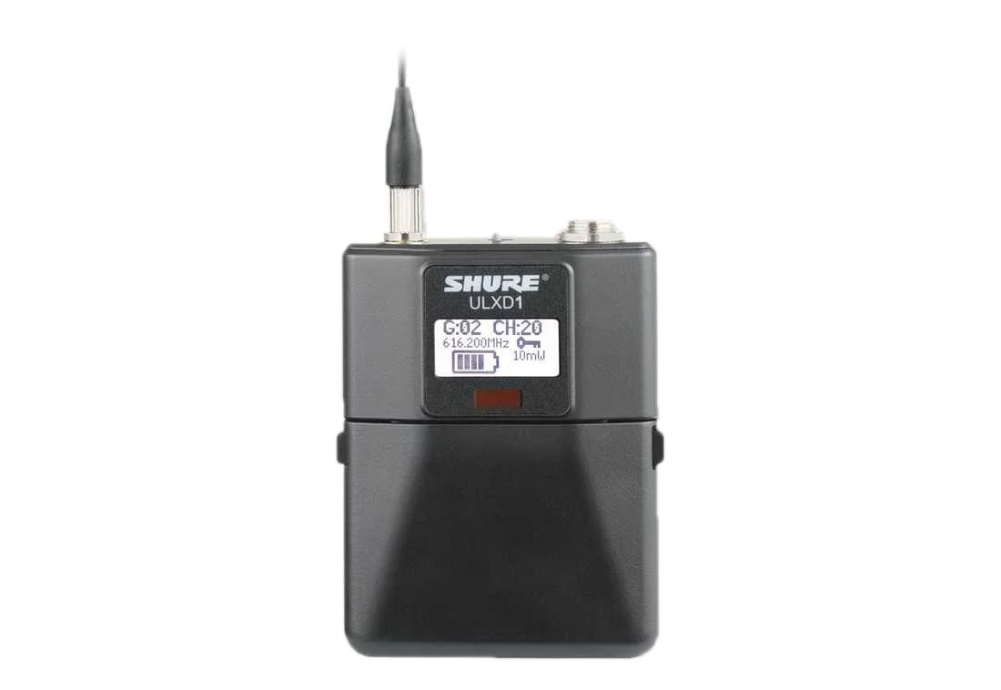 - Shure’s ULXD1 wireless bodypack transmitter provides full 20Hz-20kHz audio with automatic Gain Ranging for maximum dynamics transmission