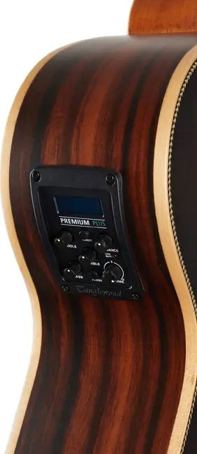 The Tanglewood TRSF CE AEB is an electroacoustic guitar of the “Super Folk” type, i.e. an instrument with a narrower and shallower body than, for example, the Dreadnought. The body of the guitar is made of laminated ebony, the grain of which gives the instrument the luxurious look you would expect from much more expensive models. Glued to the mahogany neck is an ebony-finished Eboncore composite fingerboard fitted with twenty frets. Position markers made of ABS material facilitate orientation on the fingerboard surface.