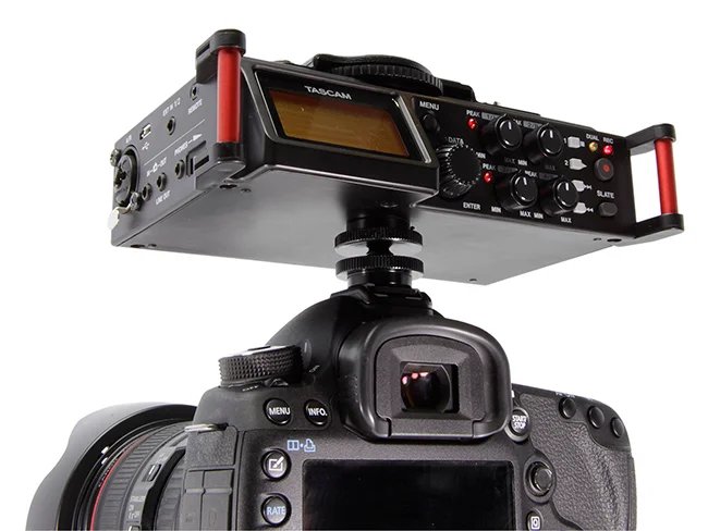 Designed as an audio recording solution for filmmakers, the DR-70D 4-Channel Audio Recording Device for DSLR and Video Cameras from Tascam features dual built-in omnidirectional microphones and is capable of recording up to 4 tracks simultaneously. It has tripod mounts on both the top and bottom of the unit and can be mounted above or below your DSLR or video camera as well as on a follow-focus cage.